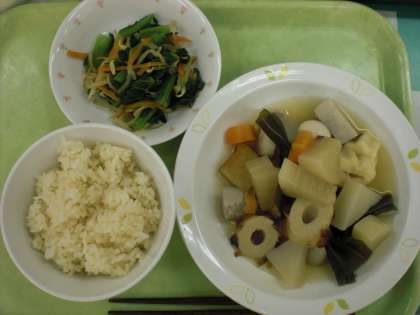 「ちゃめし、おでん、やさいのからしじょうゆかけ、牛乳」です。