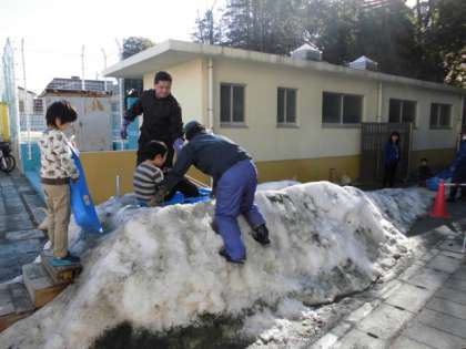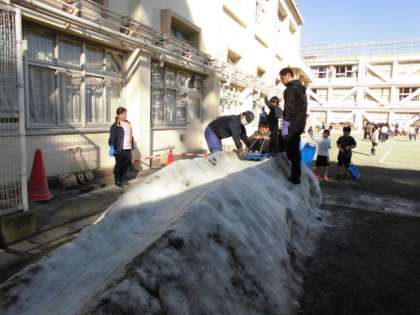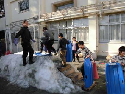 雪の滑り台が始まりました。昨日気温が高かったので心配されましたが、今週、来週は大丈夫そうです。新しいそりも用意していますので楽しんでくださいね。