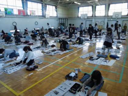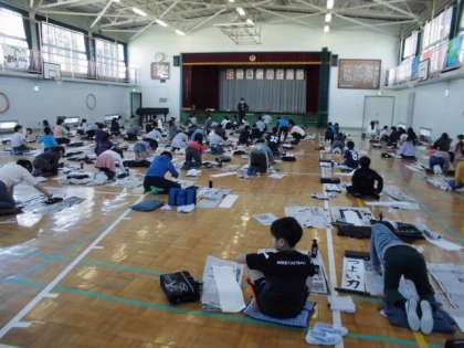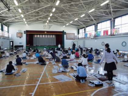 今日は3,4年生が合同で書き初めを行いました。とても静かな体育館の中、一生懸命に書いていました。