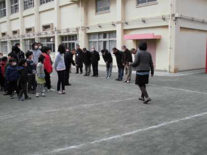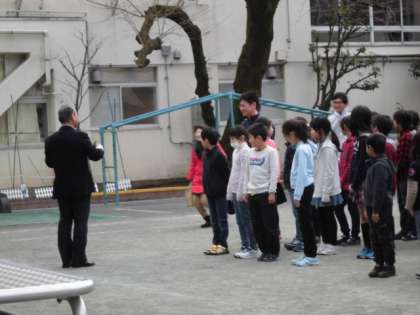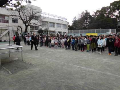 開校記念日を来週の土曜日(28日)に迎えるに当たって、もちつきつき集会が行われます。鈴木会長がお清めをしてくださり、いよいよもちつきが始まります。