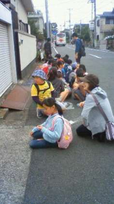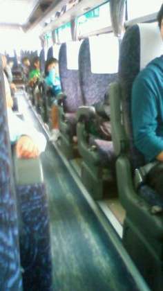 バスが到着。出発です。曇りですが、天気は大丈夫でしょう。欠席も無くみんな元気です。
