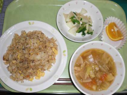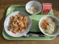 「そぼろごはん、すいとん、かぶのレモンじょうゆかけ、くだもの、牛乳」です。