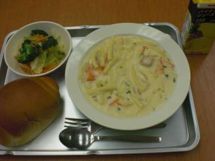 今日の給食は、バターロールパン・マカロニのホワイトソース・ブロッコリーのサラダ・ジュースです。