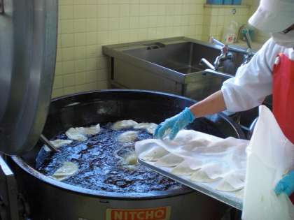 きょうの給食は、主菜の中で一番リクエストが多かった、ジャンボぎょうざです。ジャンボぎょうざに使われている大きな皮は、麺屋さんに頼んで特別に作ってもらったものです。とくせいの大きな皮に、ひとつひとつ丁寧に具をつめて、油でパリっとなるまで揚げています。