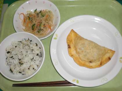 「わかめごはん、ジャンボぎょうざ、はるさめサラダ、牛乳」です。