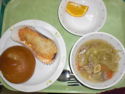 「くろざとうパン、さけのガーリックやき、マカロニスープ、くだもの、牛乳」です。