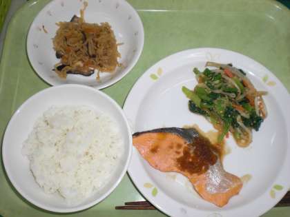 「ごはん、魚のステーキソース、切り干し大根のにつけ、野菜のごまあえ、牛乳」です。