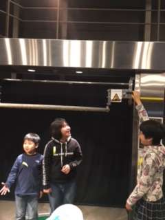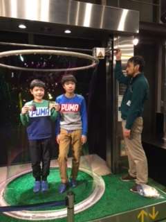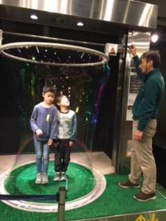 朝のラッシュの中でも、全員が静かに上手に乗り、無事に九段下の科学技術館に到着しました。楽しい実験や体験コーナーで思い切り遊びました。 写真は大きなシャボン玉に入る体験コーナーです。