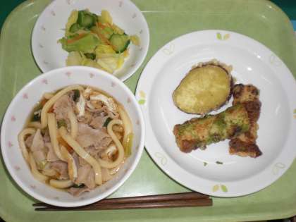 「にこみうどん、てんぷら、そくせきづけ、牛乳」です。