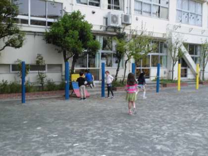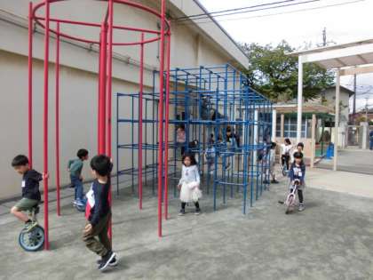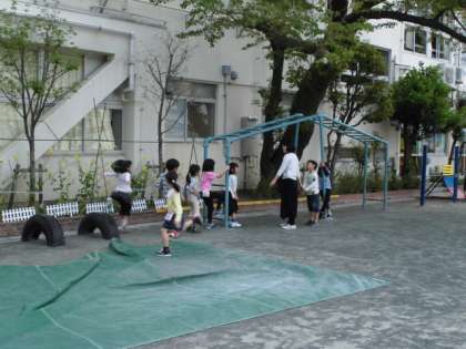 教室では少し緊張気味だった1年生も校庭に出ると、ジャングルジムや鉄棒で元気よく遊びました。これからもたくさん外で元気よく遊びましょう!