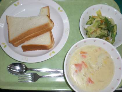 「ジャムサンド、コーンシチュー、アスパラガスのサラダ、牛乳」です。