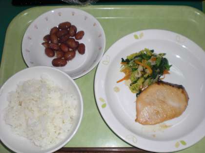「ごはん、さかなのさいきょうやき、にまめ、やさいのおかかかけ、牛乳」です。