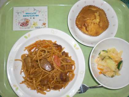「スパゲティナポリタン、やさいのイタリアンドレッシングかけ、りんごケーキ、牛乳」です。