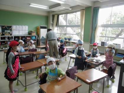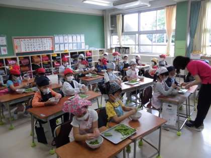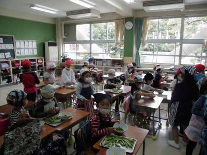 今日は1年生が旬のグリンピースのサヤ剥きを体験しました。エプロンと三角巾を着けたかわいい姿で、一生懸命丁寧に剥いていきました。自分で剥いた豆をおいしくいただきました。
