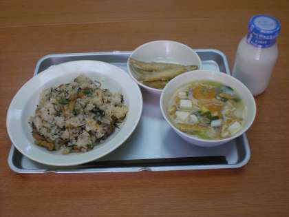 今日の給食は、磯おこわ・わかさぎのから揚げ・味噌汁・牛乳です。