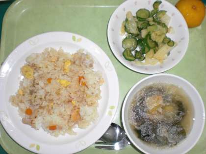 「チャーハン、野菜のちゅうか風味、くだもの、牛乳」です。