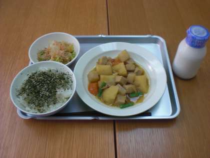 今日の給食は、ごはん・ふりかけ・肉じゃがうま煮・白菜のおかかかけ・牛乳です。