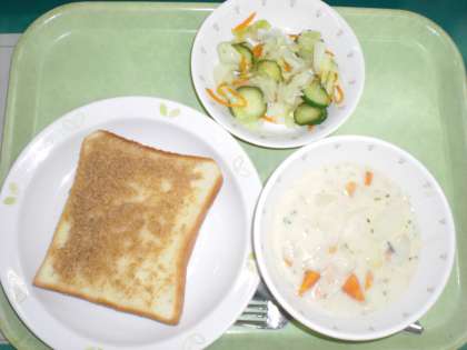 「ササミトースト、シーフードシチュー、やさいのあまずかけ、牛乳」です。