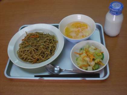 今日の給食は、ソース焼きそば・ポテト入りフレンチサラダ・フールツポンチ・牛乳です。