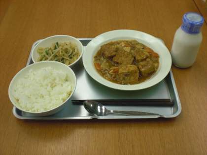 今日の給食は、ごはん・家常(ジャージャン)豆腐・もやしのごま風味・牛乳です。