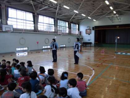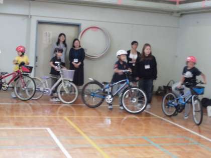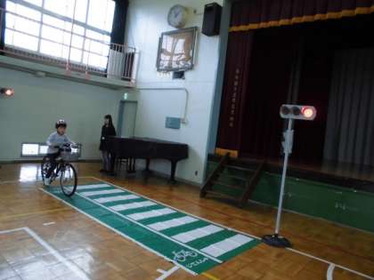 あいにくの雨で、校庭でできなかったのは残念ですが、体育館で道路の歩き方や、自転車の乗り方について学習しました。