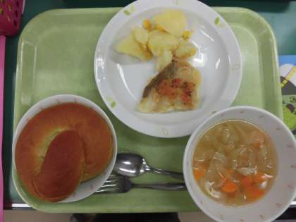 「あしたばパン、コーンポテト、さかなのラビコットソース、やさいスープ、牛乳」です。