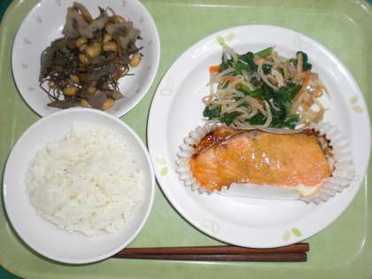 「ごはん、おひたし、魚のみそマヨネーズやき、きざみ昆布の五目に、牛乳」です。