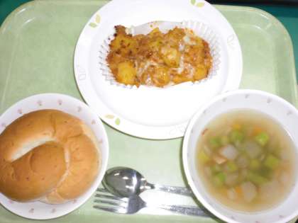 「サセミパン、ポテトグラタン、アスパラいりコンソメスープ、牛乳」です。