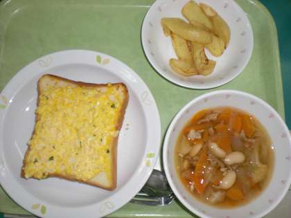 「たまごトースト、フライドポテト、しろいんげんまめのいなかふうスープ、牛乳」です。