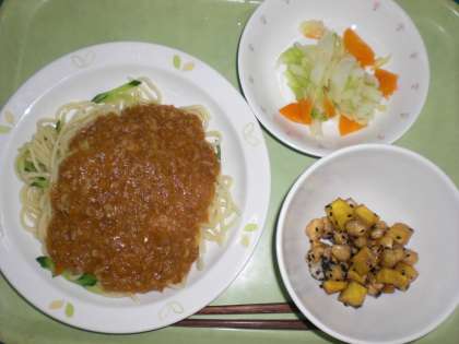 「ジャージャーめん、やさいのひとしお、おまめかりんとう、牛乳」です。