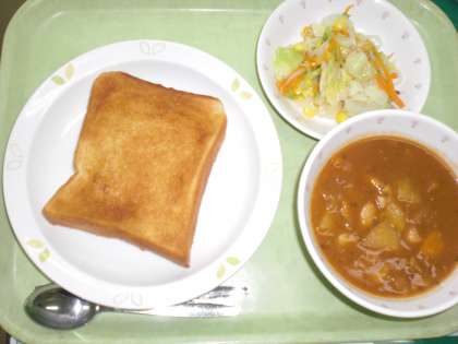 「シナモントースト、ビーンズシチュー、やさいのイタリアンかけ、牛乳」です。