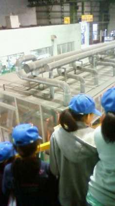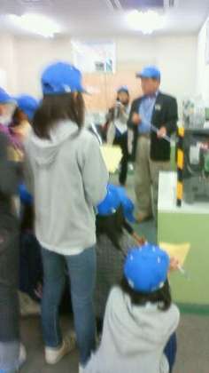 今日は社会科見学。バスに乗ってリサイクル工場や製鉄所、東芝科学館にいきます。最初は帽子を借りてリサイクル工場見学、そして、東芝科学館で見学をしてお弁当です。