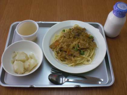 子どもたちの大好きなメニューの一つにカレーライスがあります。今日は、ライスではなくスパゲッティにカレーソースをかけたものです。手作りのカレーソースは、給食を作っている最中から、おいしそうな香りをぷんぷんさせています。子どもたちもおなかをすかせて給食を待っていたことでしょう。元気にモリモリ食べて、活動してほしいと思います。