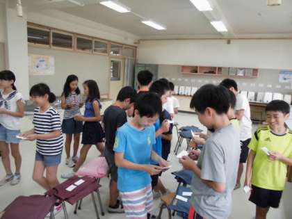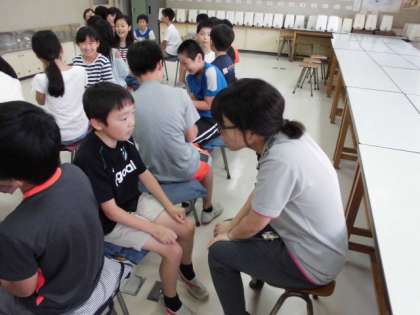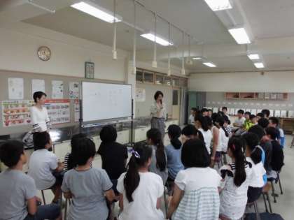 5年生がゲストティーチャーからおもてなしについて学びました。あいさつの仕方や話の聞き方、名刺の交換など様々なことを体験しました。
