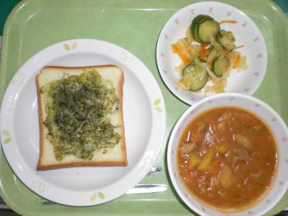 「じゃこトースト、トマトシチュー、やさいのイタリアンドレッシングかけ、牛乳」です。