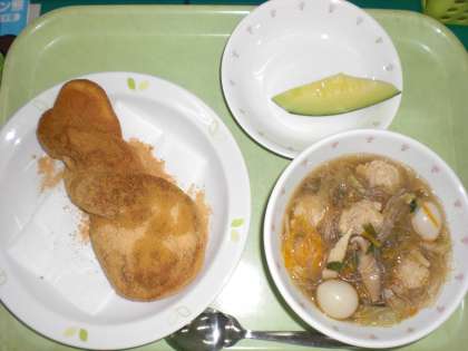 「あげパン、にくだんごいりはるさめスープ、くだもの、牛乳」です。