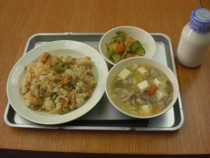 今日の給食は、子ぎつねごはん・さつま汁・シャキシャキ野菜・牛乳です。