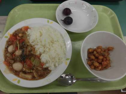 「ちゅうかどん、だいずとじゃこのあまからあげ、くだもの、牛乳」です。
