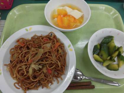 「ソースやきそば、きゅうりのちゅうかあじ、あんにん豆腐、牛乳」です。