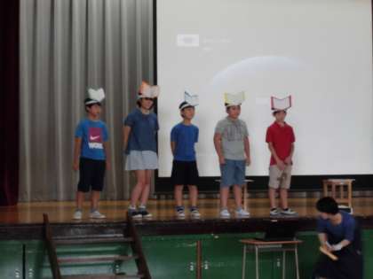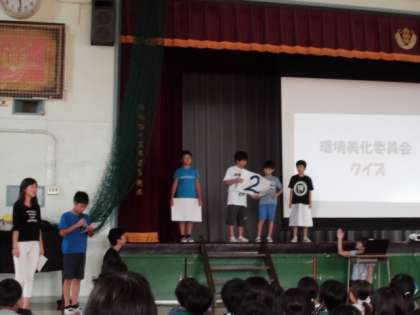 今朝は児童集会が行われ、図書委員会と環境美化委員会からの発表がありました。発表はとても工夫がされていて、分かりやすかったですね。