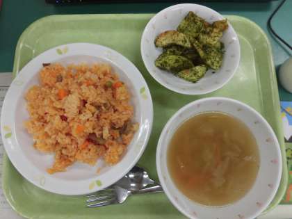 「チキンライス、あおのりポテト、やさいスープ、牛乳」です。