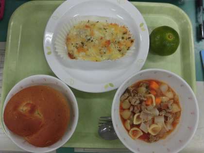 「セサミパン、ミネストローネ、ポテトクリームやき、くだもの、牛乳」です。