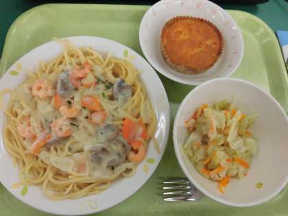 「スパゲティクリームソース、キャベツサラダ、りんごケーキ、、牛乳」です。