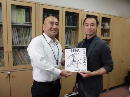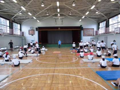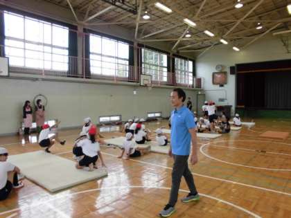 今日はアテネオリンピック体操男子団体の金メダリスト、鹿島丈博さんが来て下さいました。3時間目に講話を聞き、4時間目は5,6年生に前転や後転の指導をして下さいました。みなさんとてもよい経験になりましたね。校長先生がみなさんを代表してサインをもらいました!!