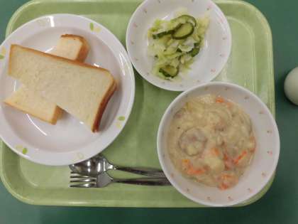 「ジャムサンド、クリームシチュー、フレンチサラダ、牛乳」です。