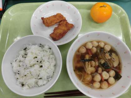 「わかめごはん、いかのかりんとあげ、あんかけじる、くだもの、牛乳」です。