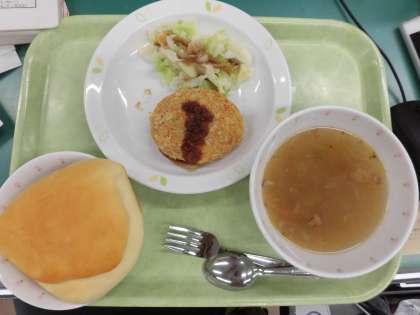 「ミルクパン、コロッケ、ゆでキャベツ、コンソメスープ、牛乳」です。