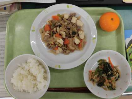 「ごはん、すきやきに、やさいのごまあえ、くだもの、牛乳」です。