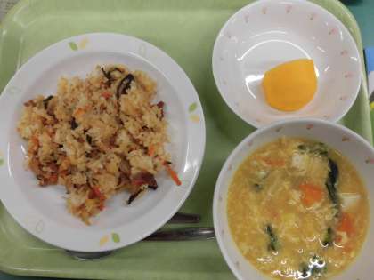 「キムチチャーハン、ちゅうかふうコーンスープ、くだもの、牛乳」です。