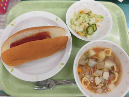 「ウィンナーサンド、ミネストローネ、フレンチサラダ、牛乳」です。